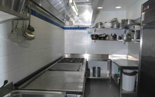 La cuisine, réaménagée et modernisée en 2005, se divise en cuisine chaude et froide. Équipée de matériel professionnel, elle permet le ravitaillement aisé d'un grand nombre de personnes. Compris dans le prix de location, vous disposerez des équipements suivants: un fourneau à 4 brûleurs au gaz, deux fours à gaz et une plaque coup de feux au gaz, une étuve chauffante électrique, hotte aspirante, réfrigérateur professionnel, eau chaude et froide. Avec les équipements en acier inoxydable, le sol et les murs carrelés et les deux grandes fenêtres, la cuisine est un atelier agréable et d'un entretien facile. Vous trouverez dans les armoires couverts, assiettes, saladiers et verres.